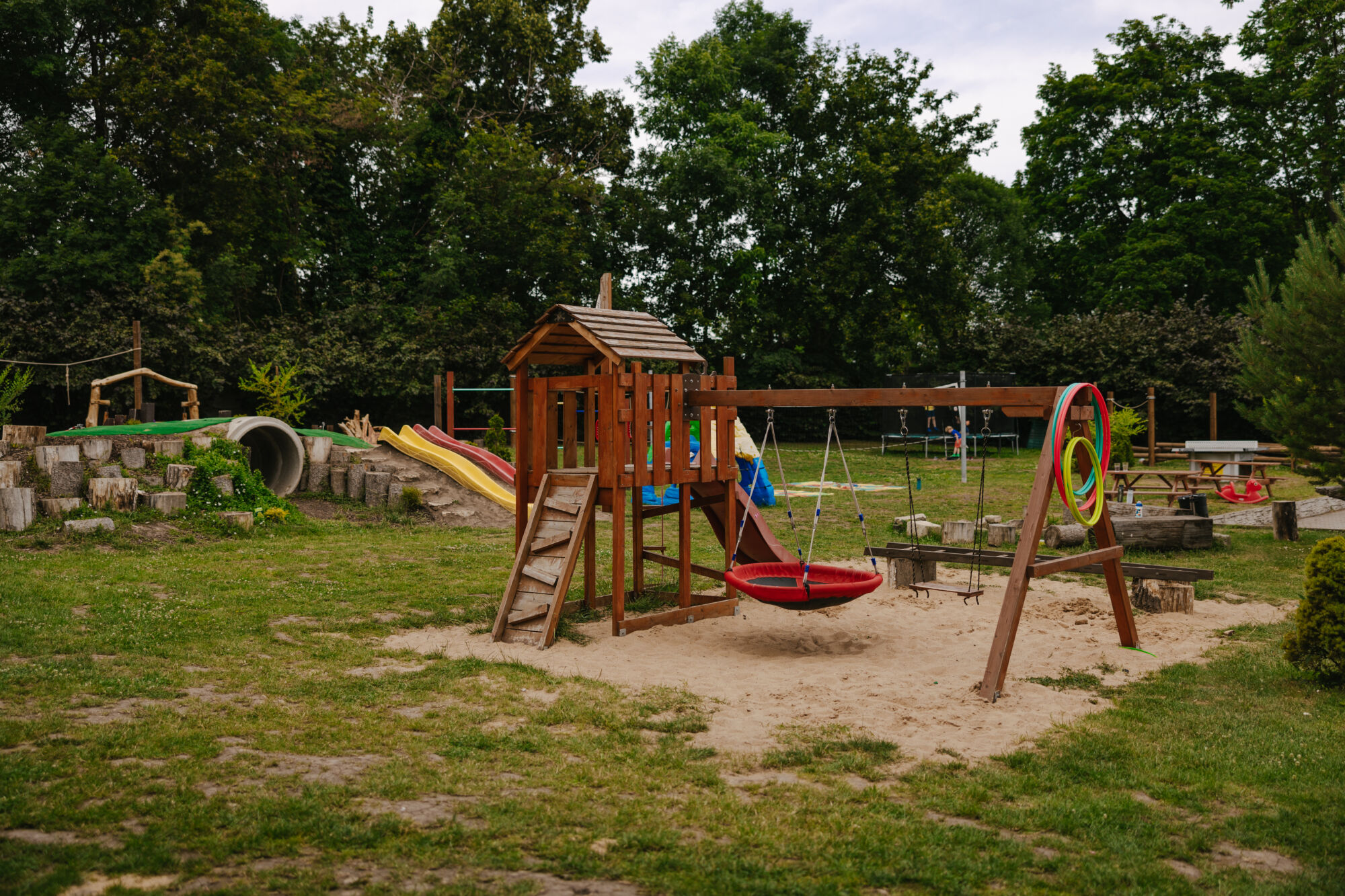 Zahrada nabízí herní prvky, prolézačky, trampolínu, ohniště i dostatek místa pro volnou hru.